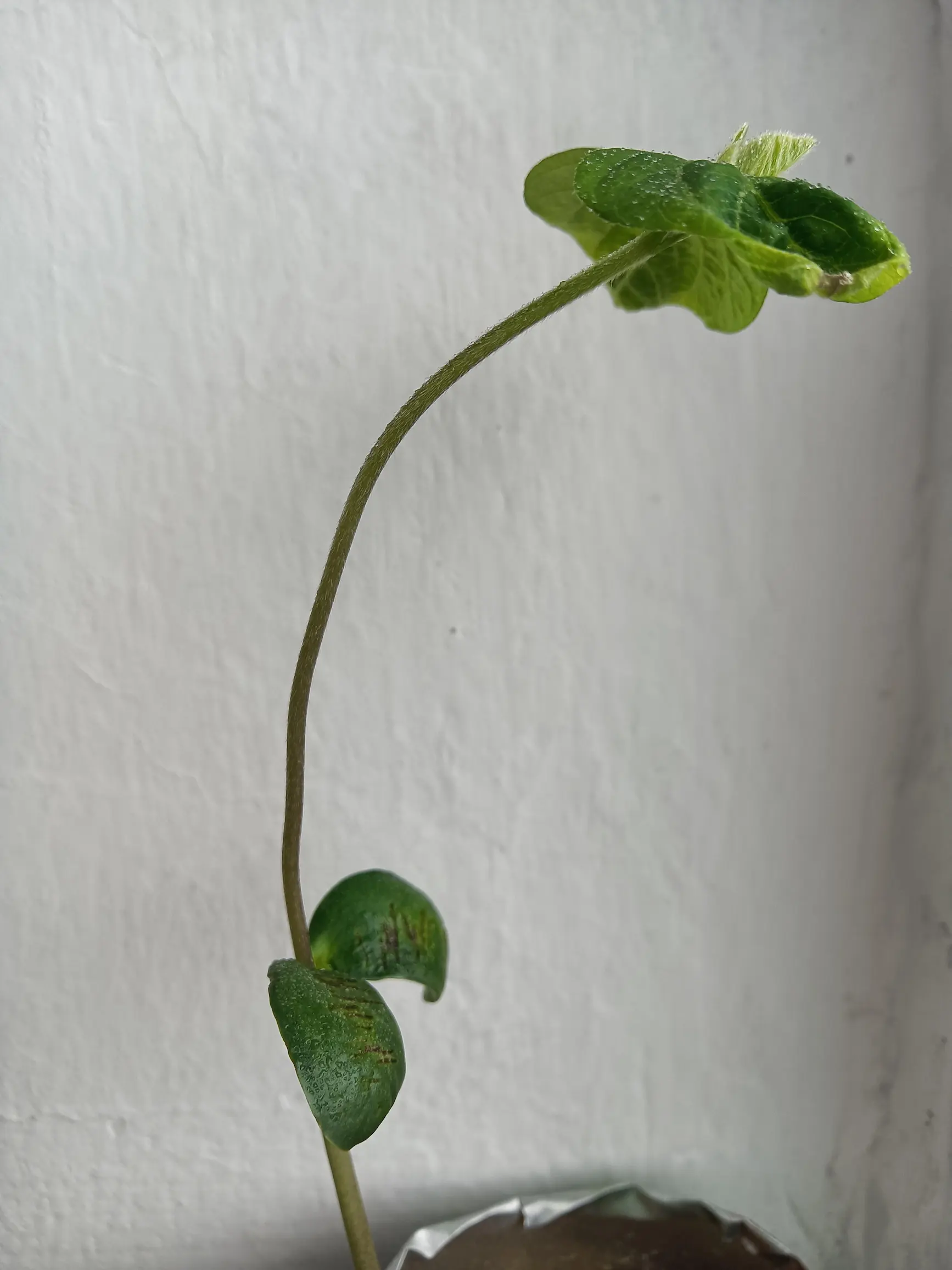 总共长出了三组叶片。让我觉得疑惑的是,最先长出来的第一组叶片,只有两片叶片,但是后面生长的叶片,每组都有三片叶片;并且第一组叶片的形态与其他的叶片形态并不相同,第一组叶片比较园,且叶片较厚,而其他几组的叶片比较尖,且叶片较薄。