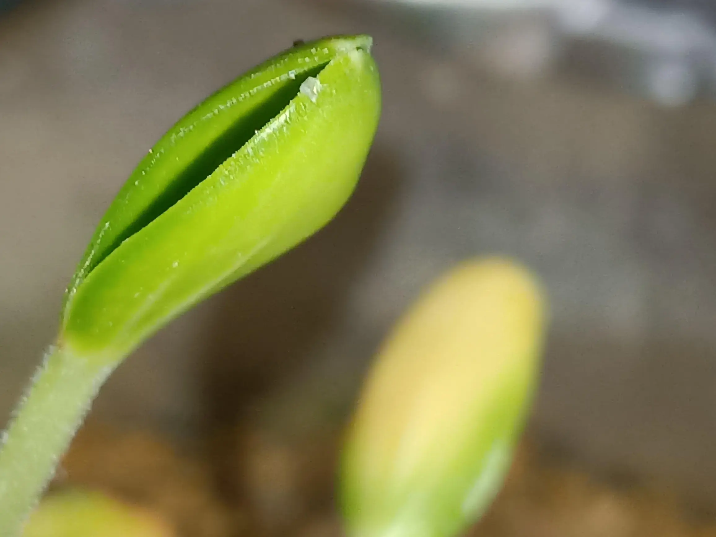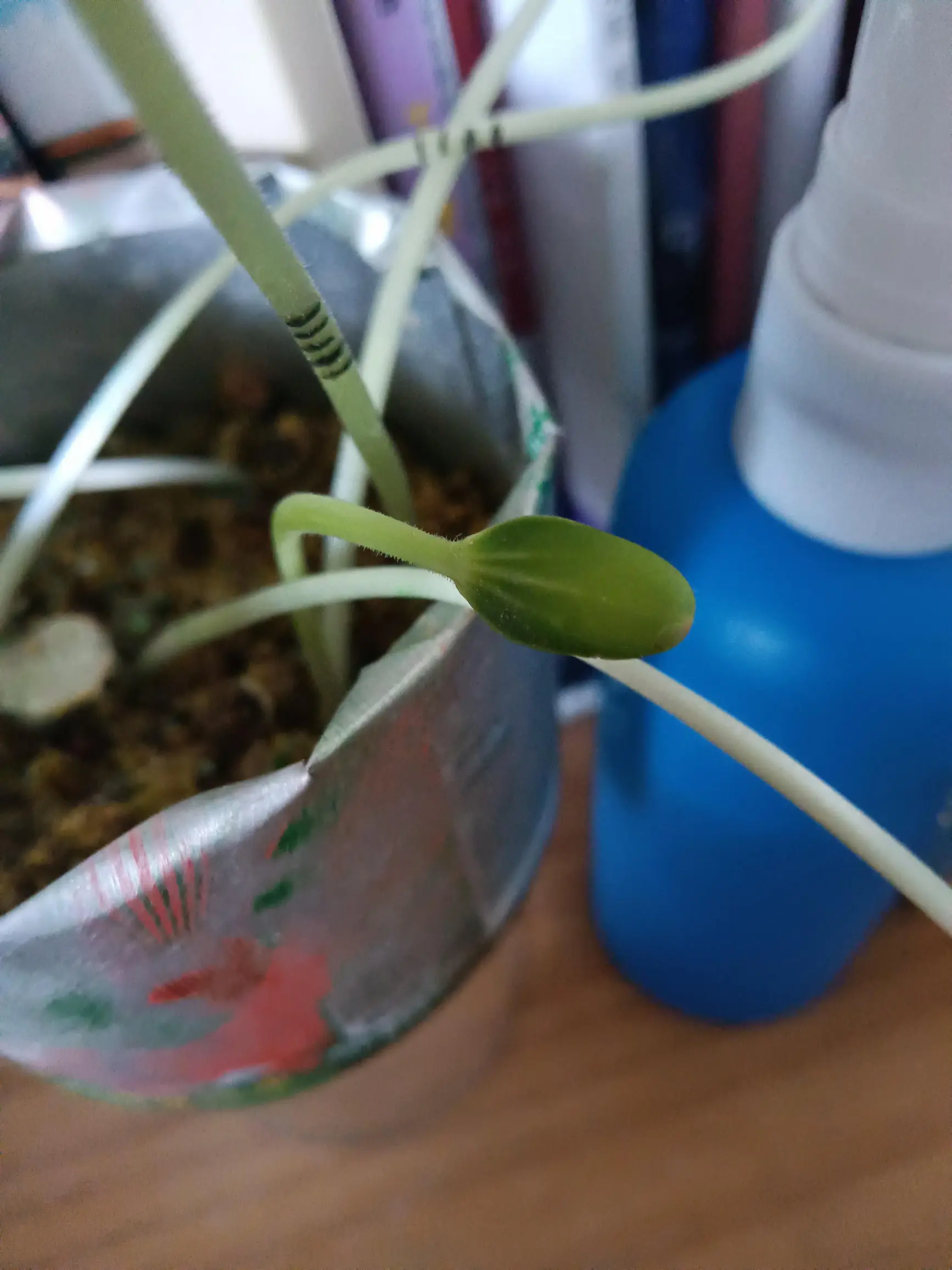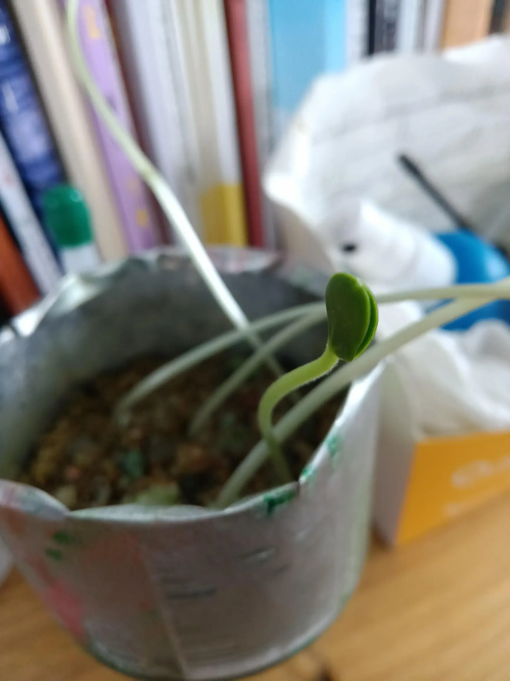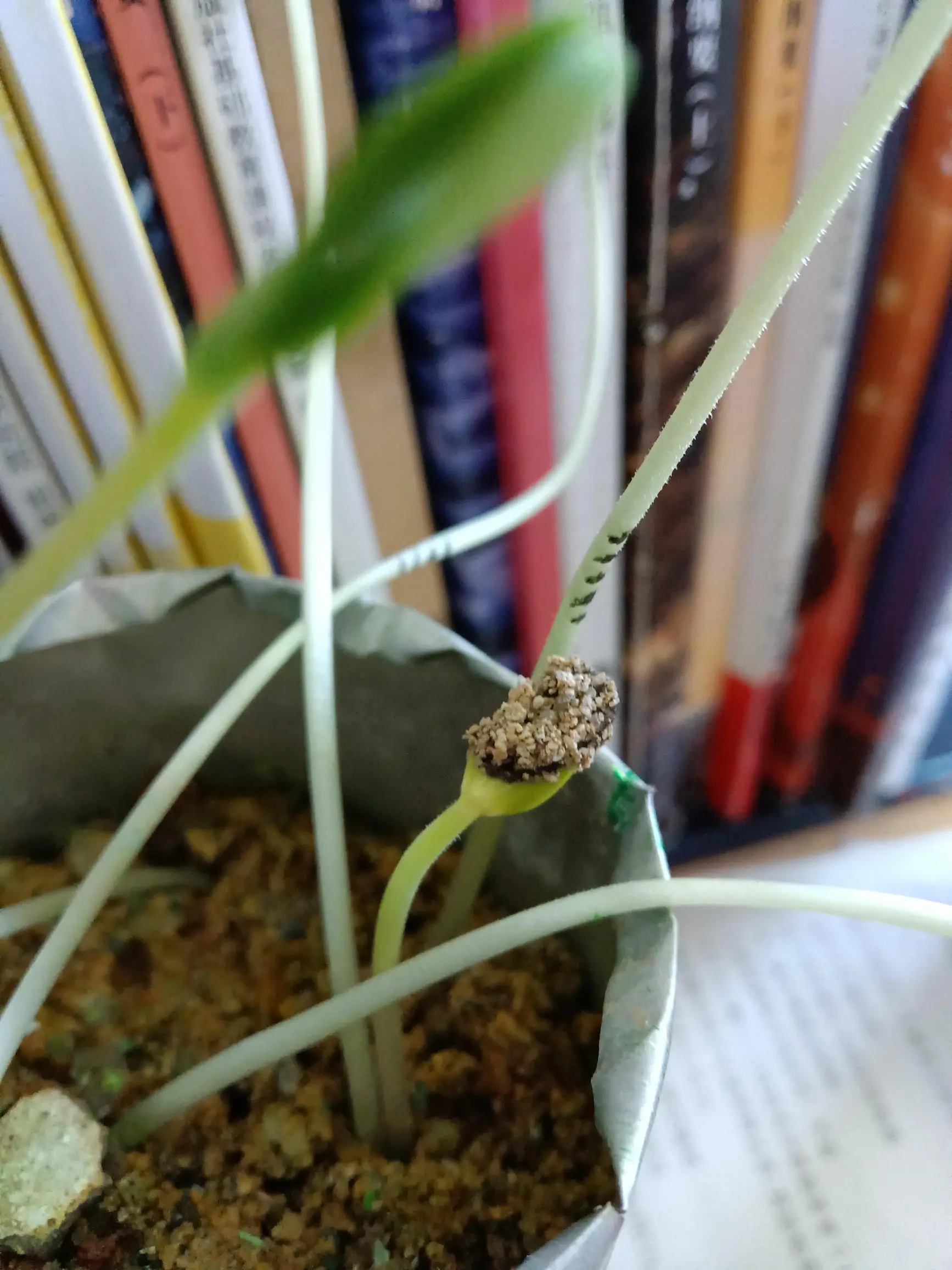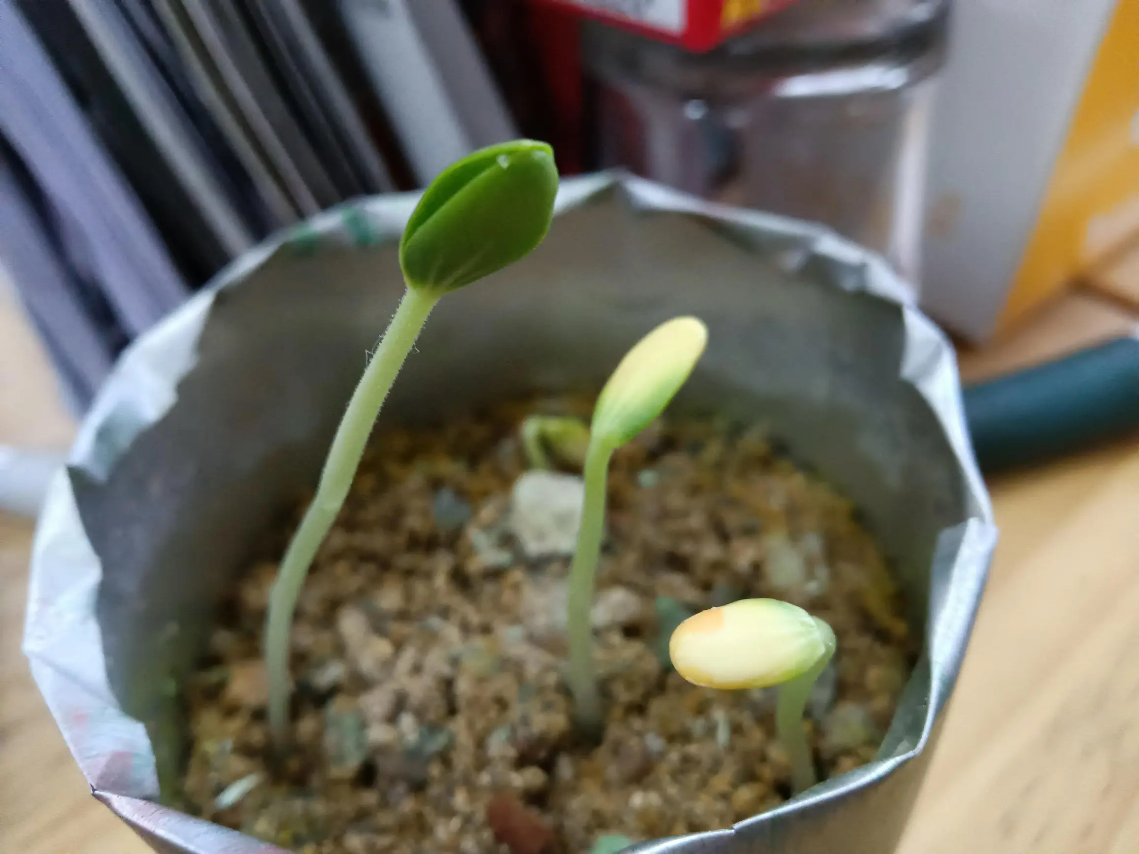 先长出来了三棵,其中两棵子叶上有一堆土,我看了半天,用螺丝刀弄了半天也没把土弄掉,这什么土啊,粘性这么强…结果呢,是子叶外面还套着一层种壳。我不懂,但感觉这种壳可能会影响植株的发育,而且上面的土弄到桌子上到处都是就不好了(自从带了土,桌上就一直有土的颗粒),就把棵去掉了,看起来没伤到子叶。两个被种壳包住的子叶还是嫩黄色的。