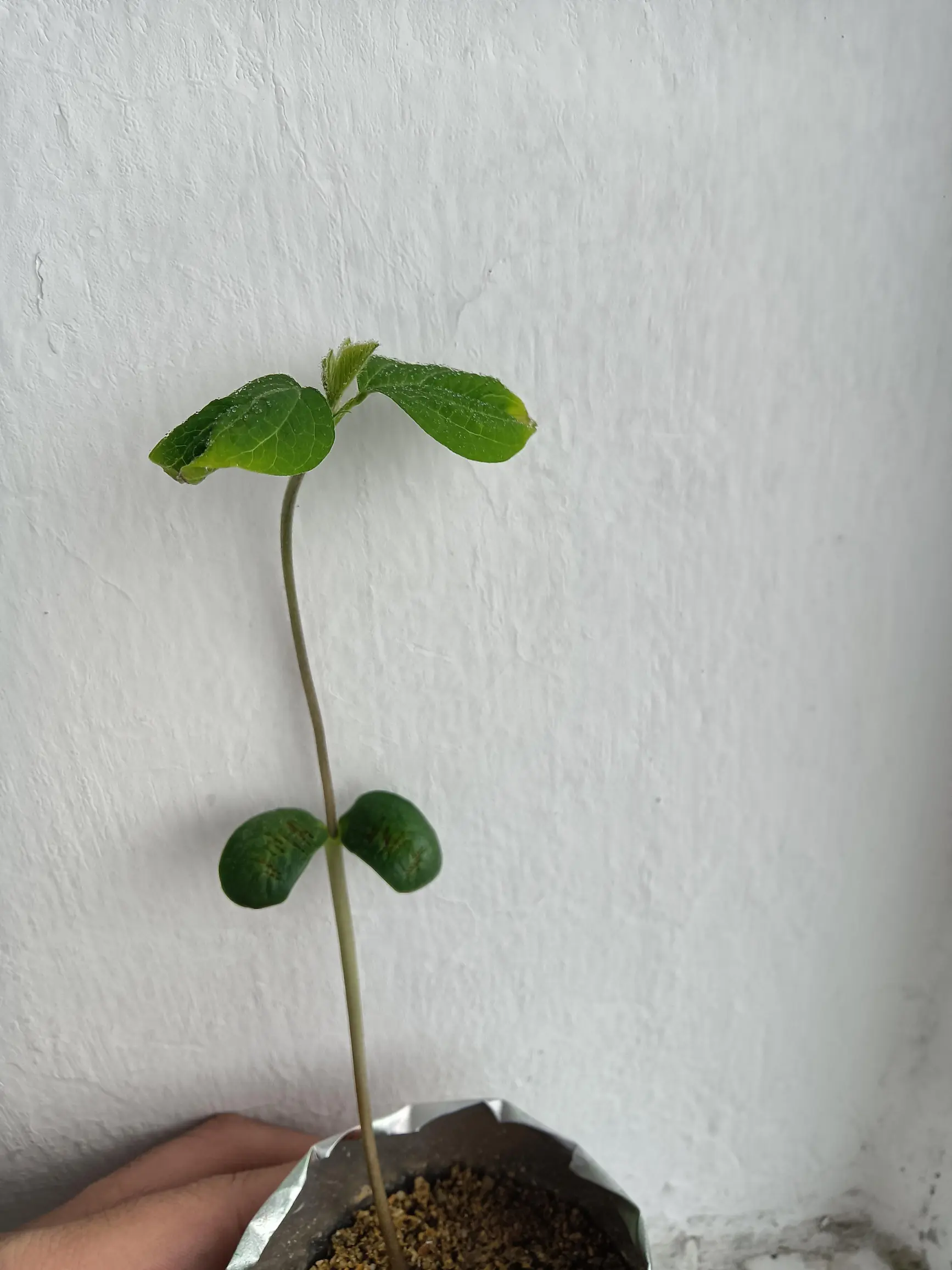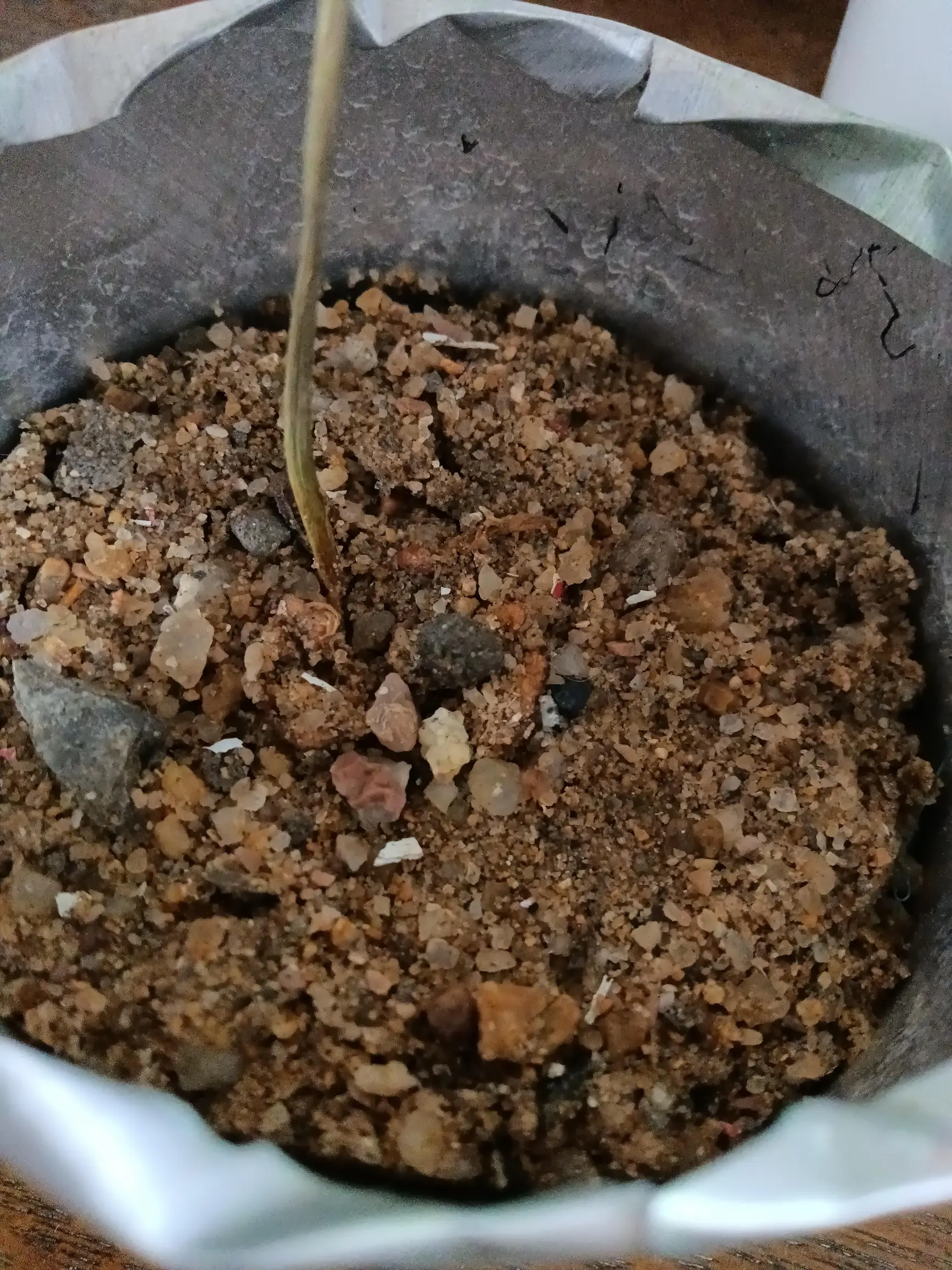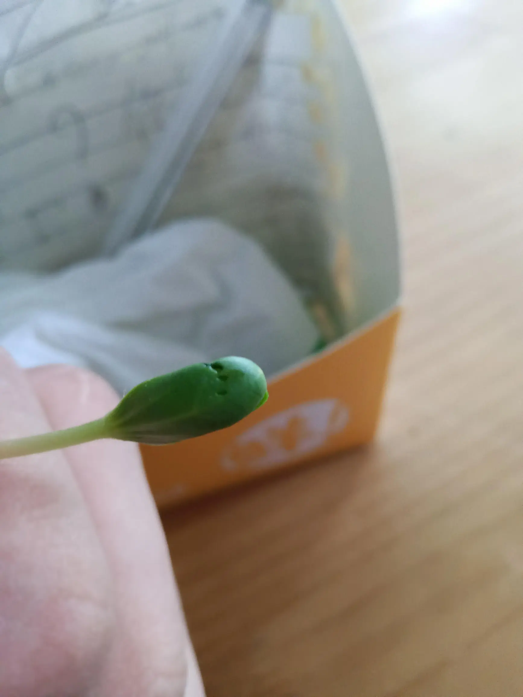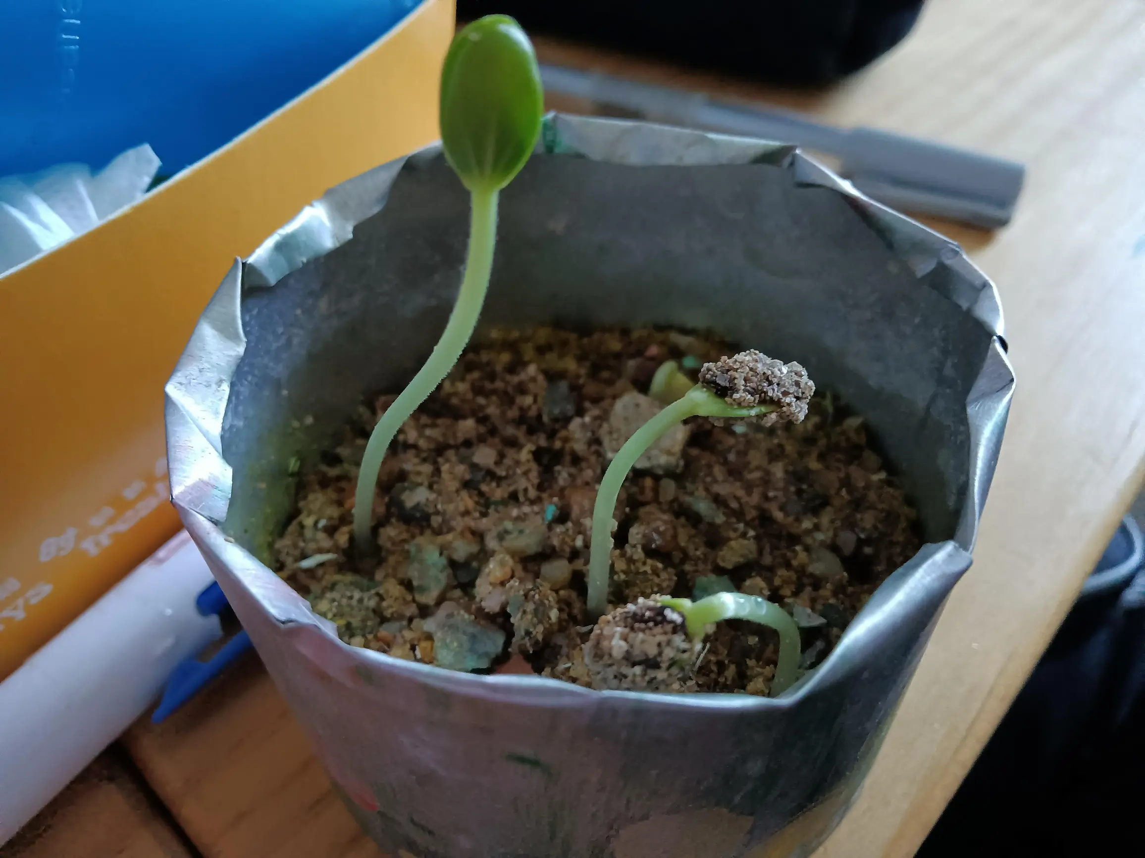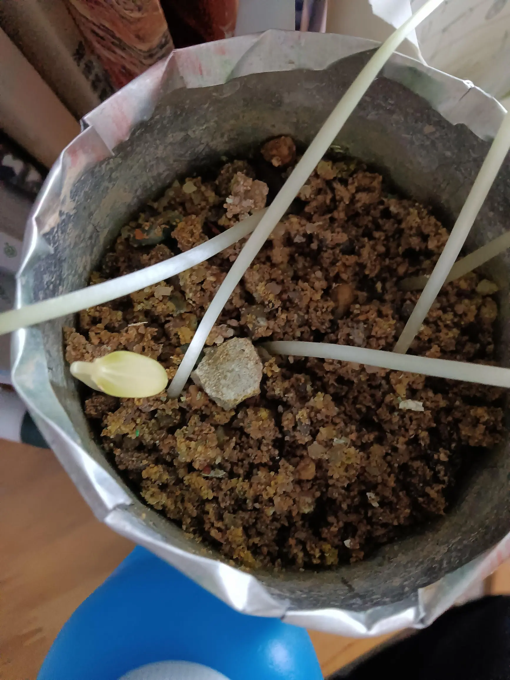 先长出来了三棵,其中两棵子叶上有一堆土,我看了半天,用螺丝刀弄了半天也没把土弄掉,这什么土啊,粘性这么强…结果呢,是子叶外面还套着一层种壳。我不懂,但感觉这种壳可能会影响植株的发育,而且上面的土弄到桌子上到处都是就不好了(自从带了土,桌上就一直有土的颗粒),就把棵去掉了,看起来没伤到子叶。两个被种壳包住的子叶还是嫩黄色的。