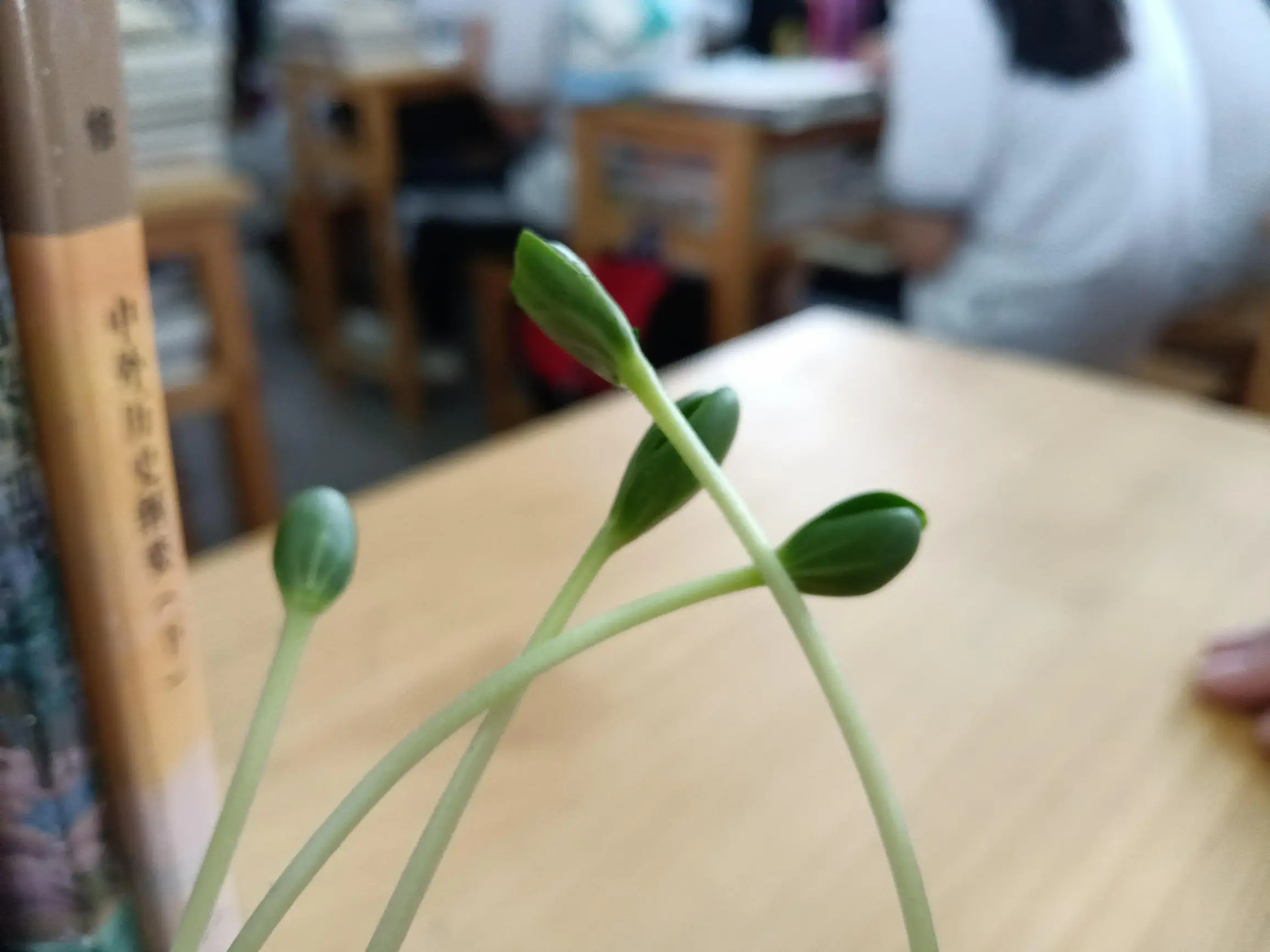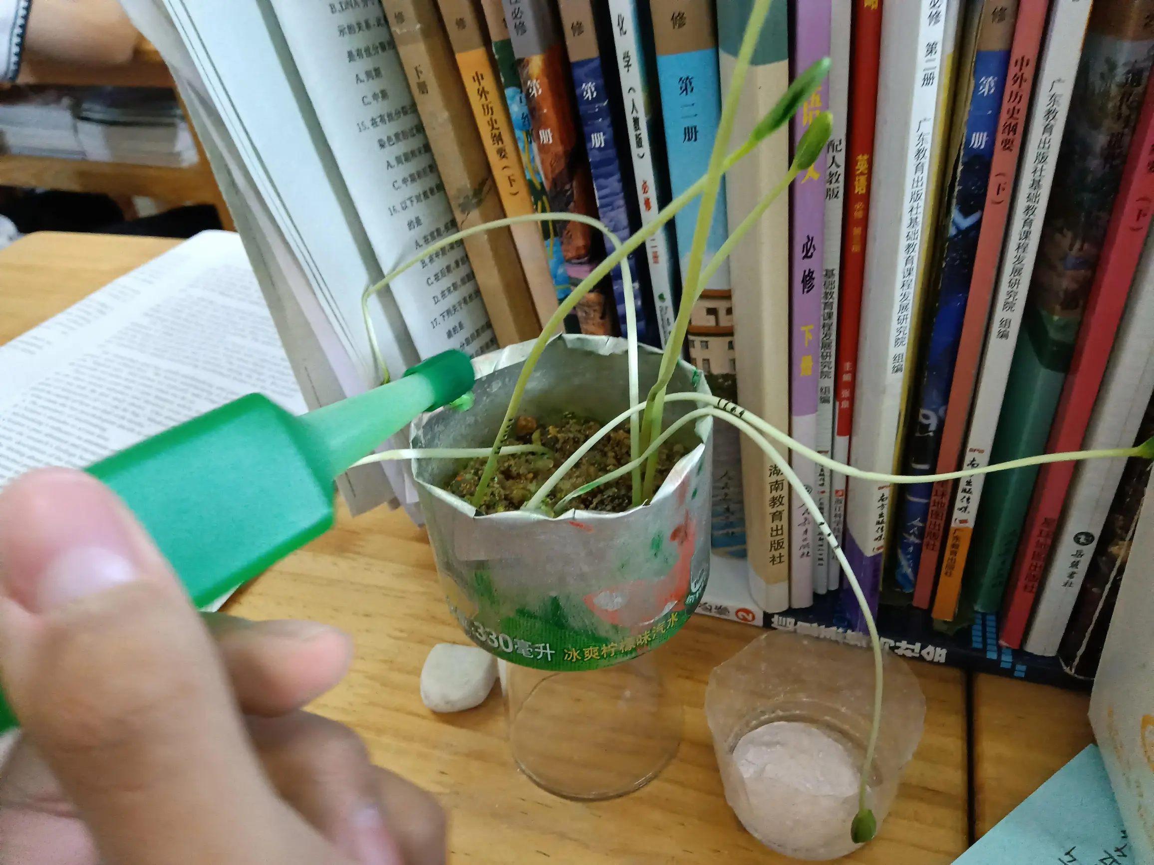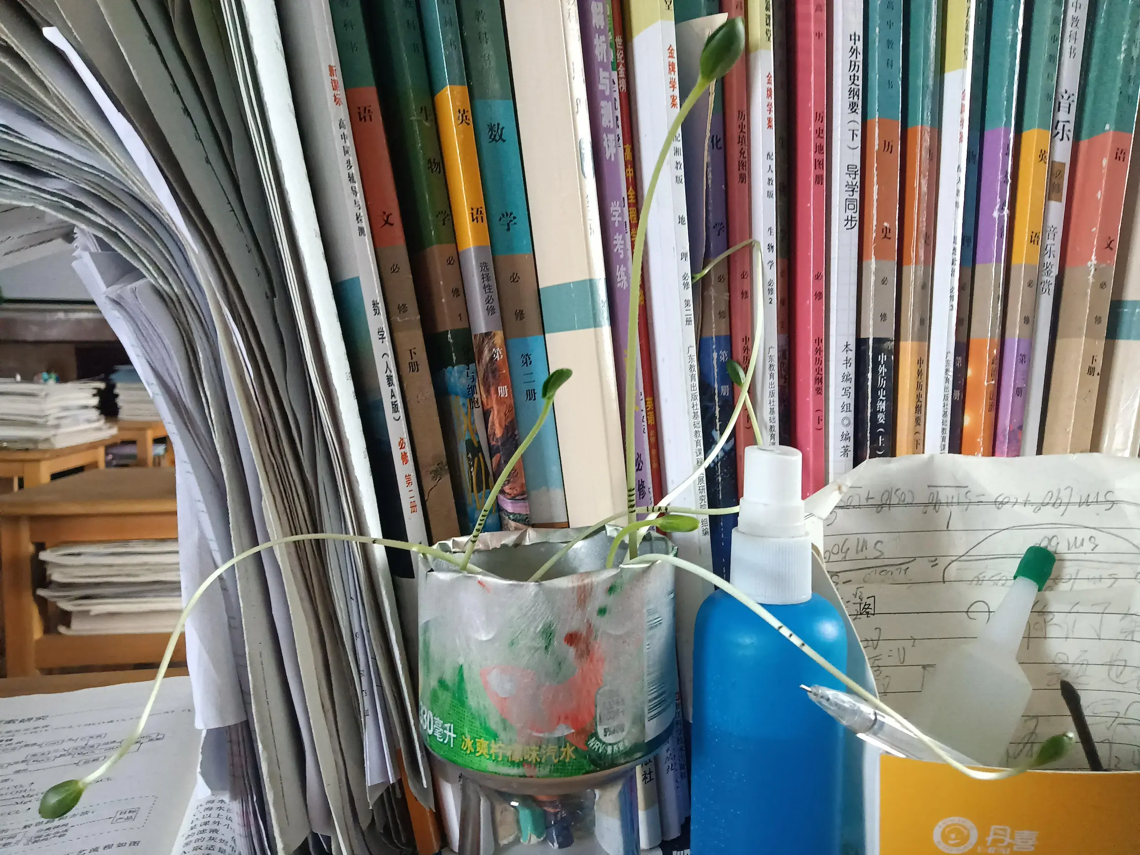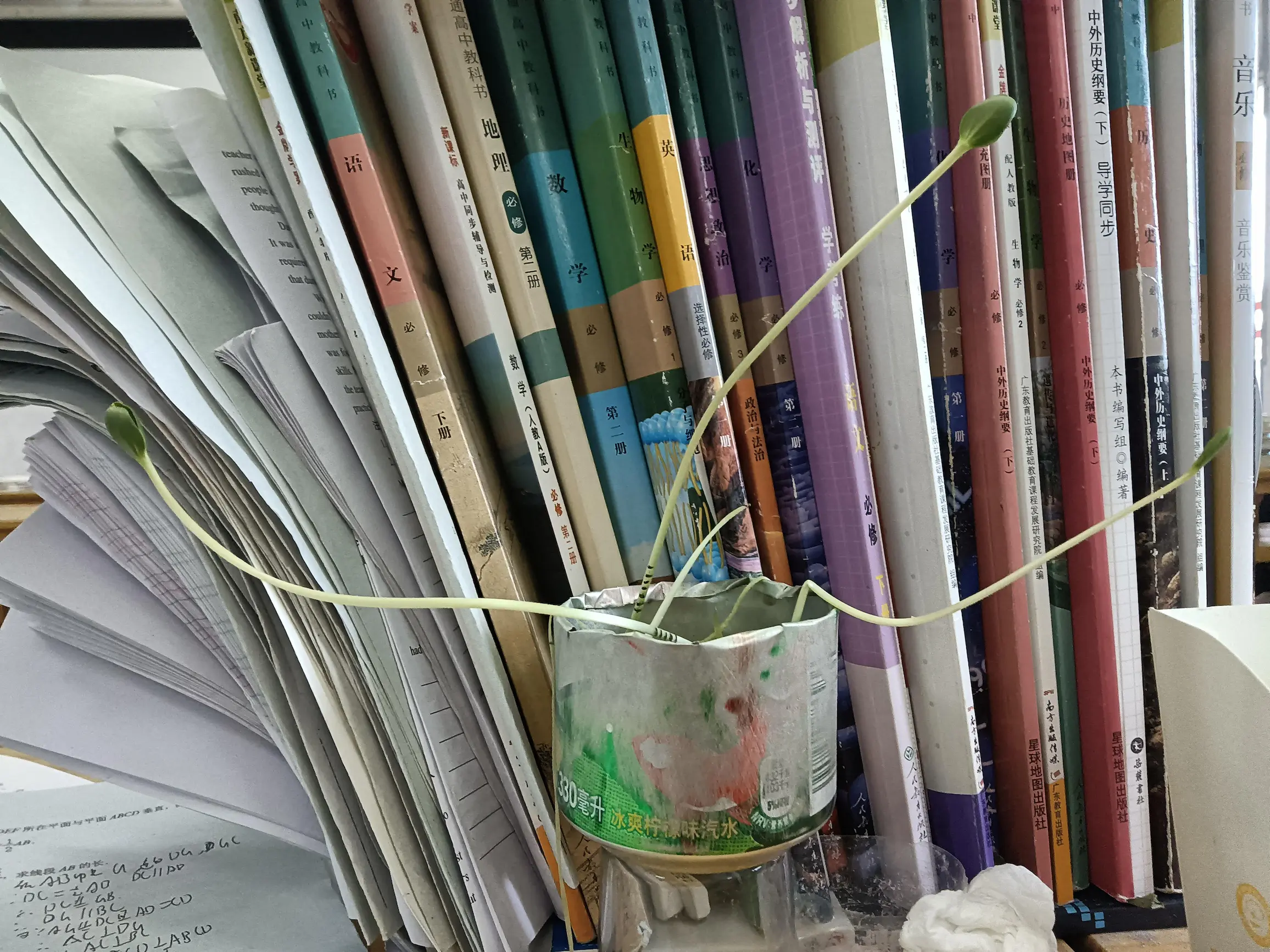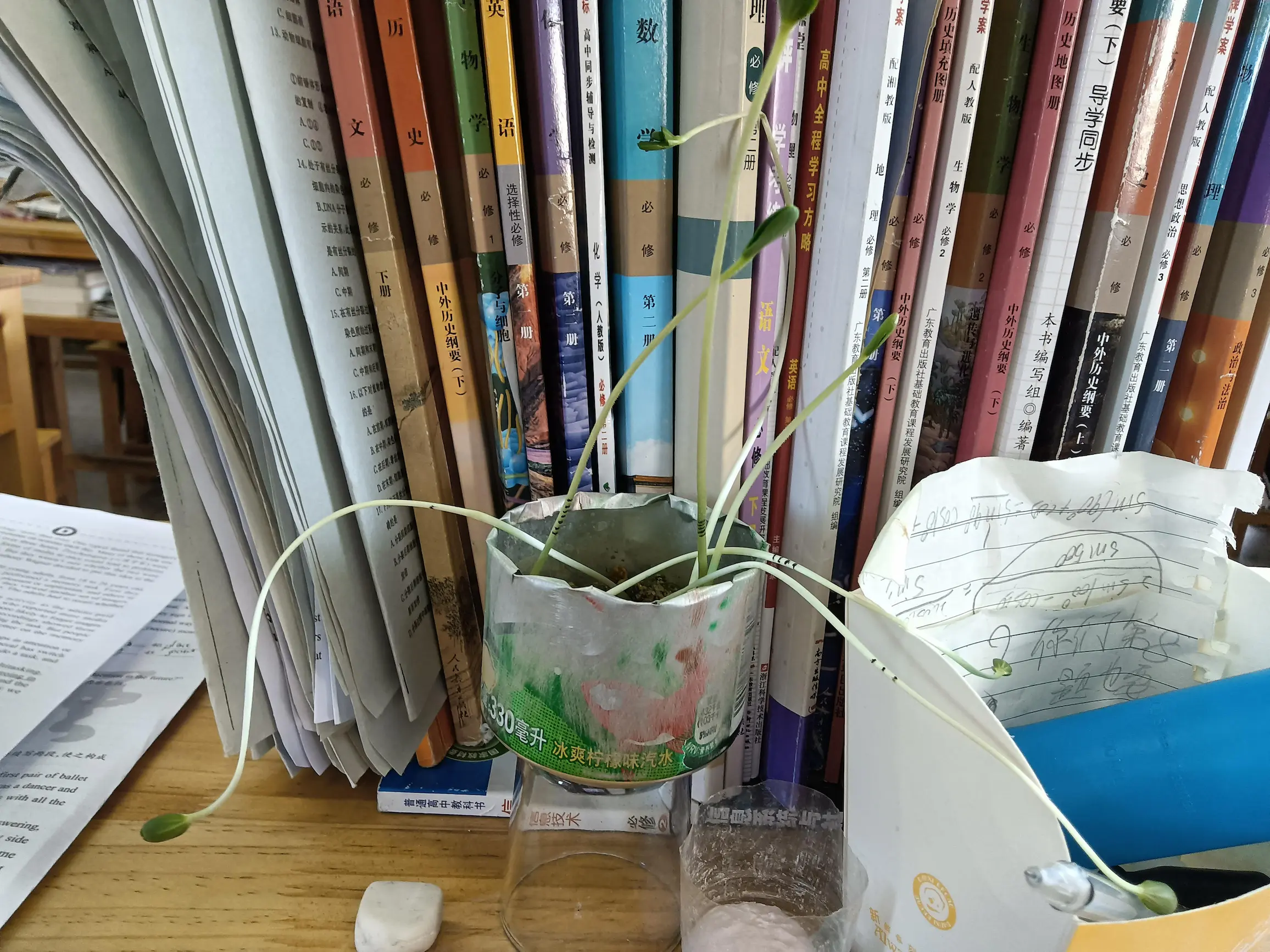 再过几天就要考试了,好多教室要作为考场,我所在的教室也是。于是我便将这棵黄豆搬到讲台上,靠在教室里原本那盆盆景上面。后来 Honzer 偶尔有来浇水,他还看见过有在那个考场的同学也有去浇水。