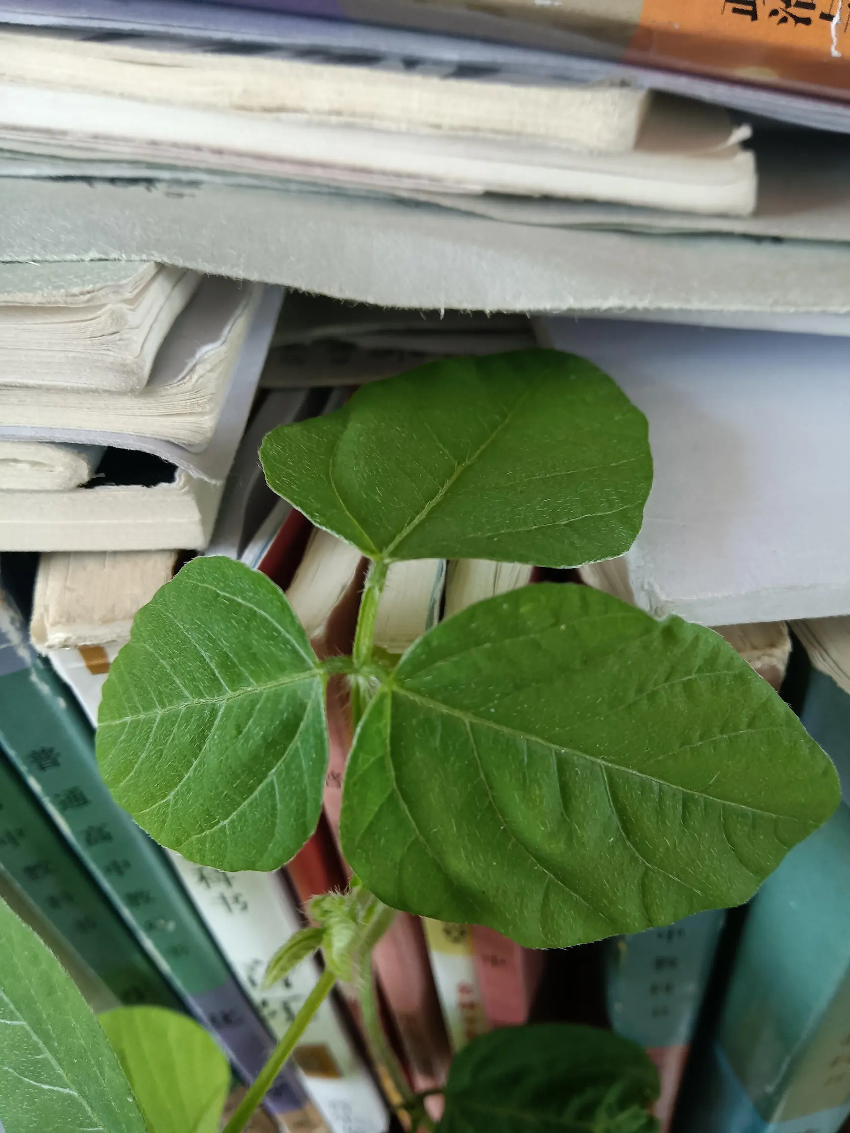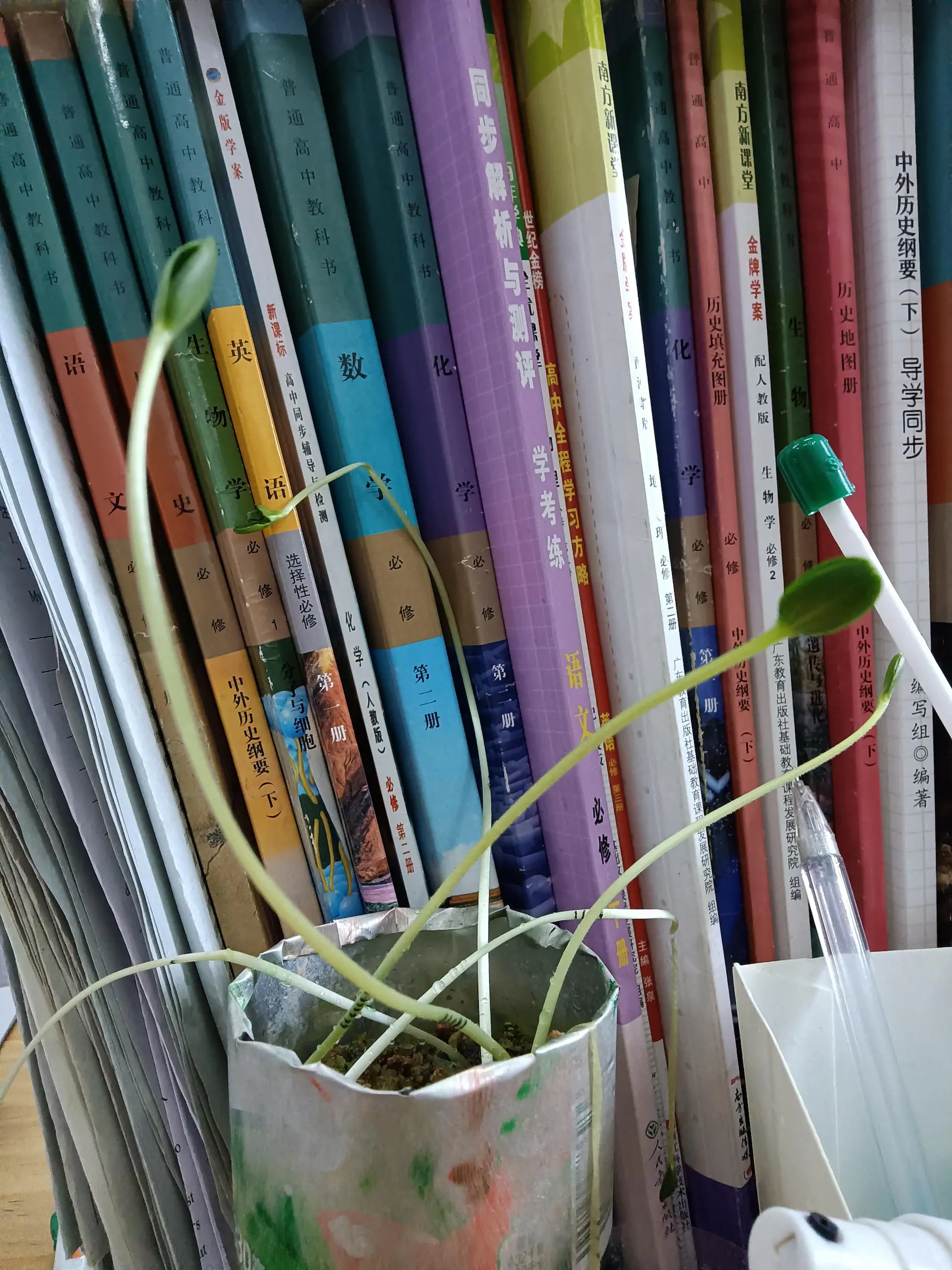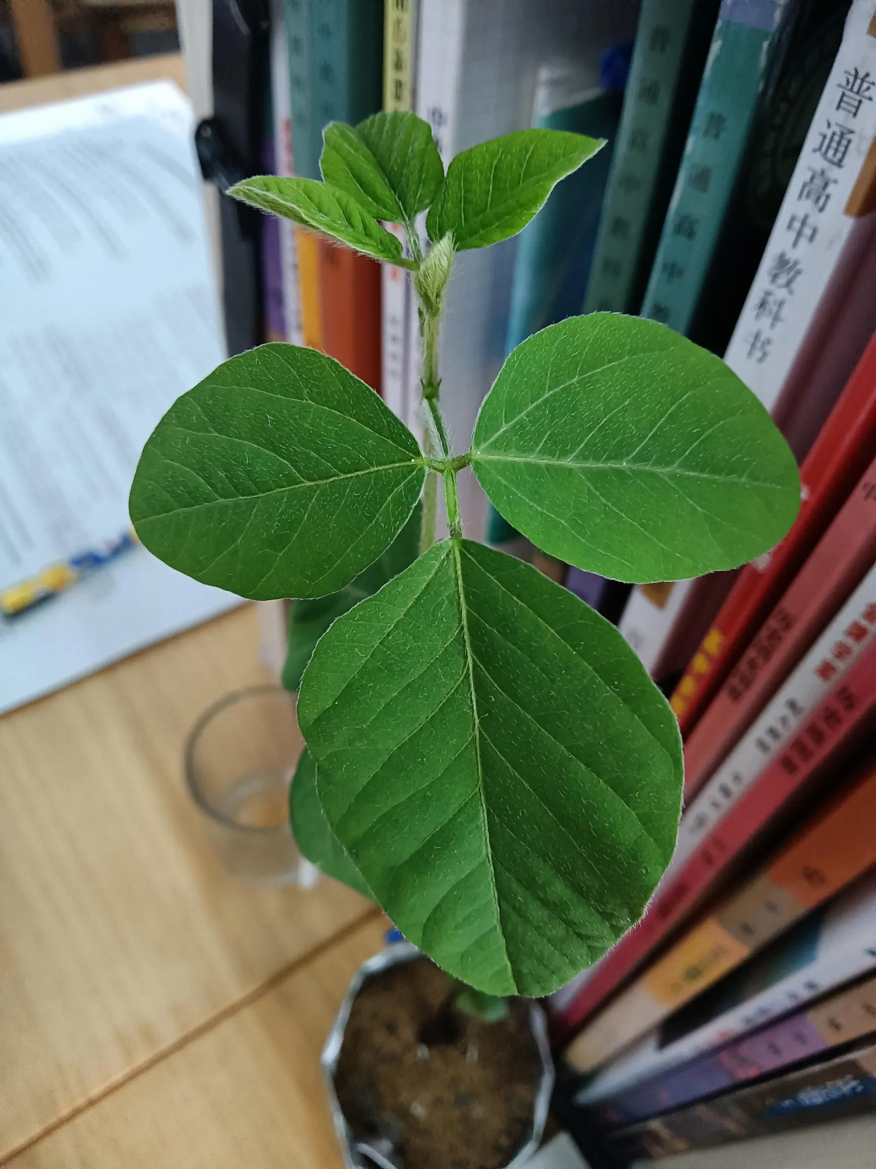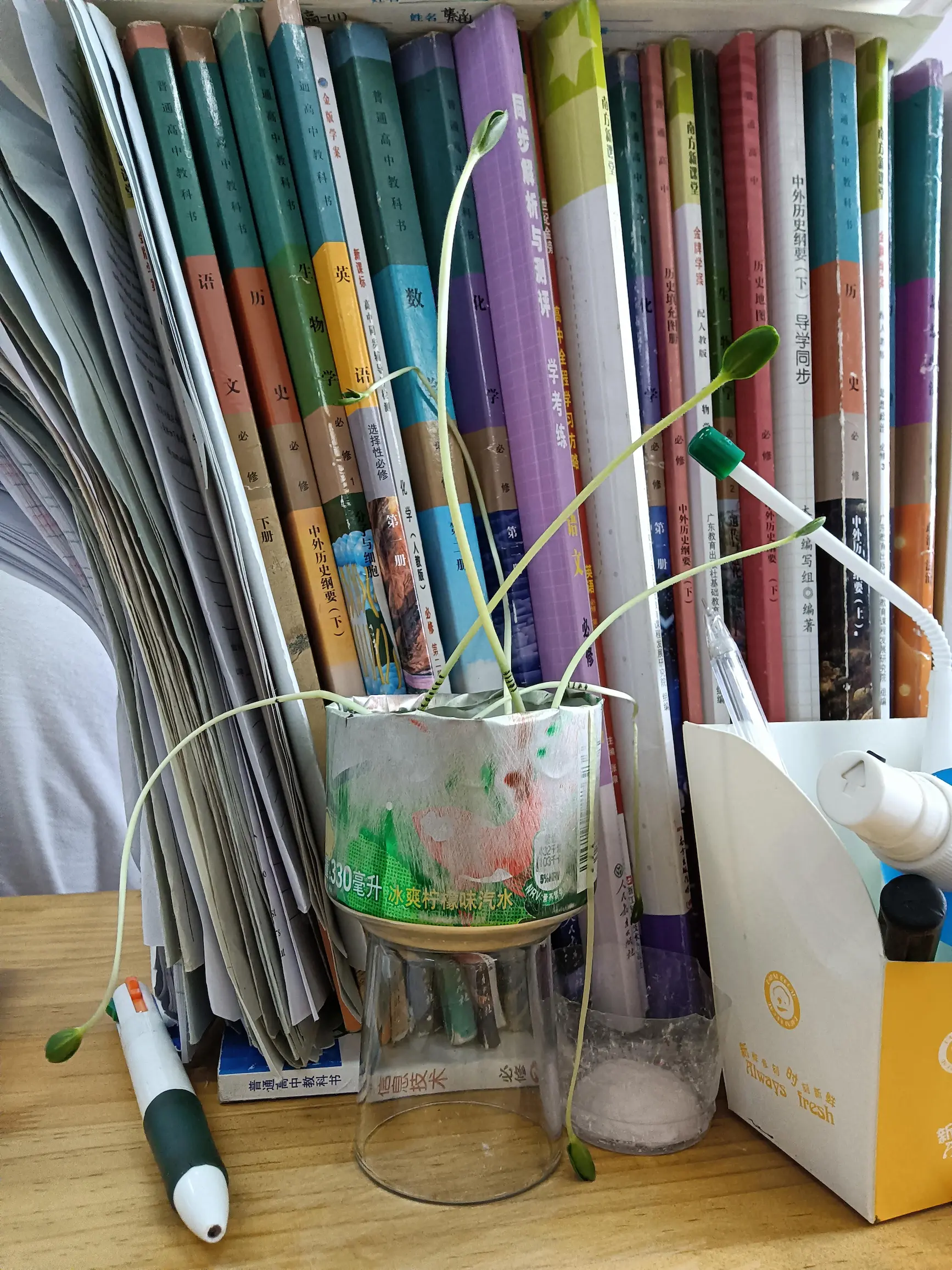 再过几天就要考试了,好多教室要作为考场,我所在的教室也是。于是我便将这棵黄豆搬到讲台上,靠在教室里原本那盆盆景上面。后来 Honzer 偶尔有来浇水,他还看见过有在那个考场的同学也有去浇水。