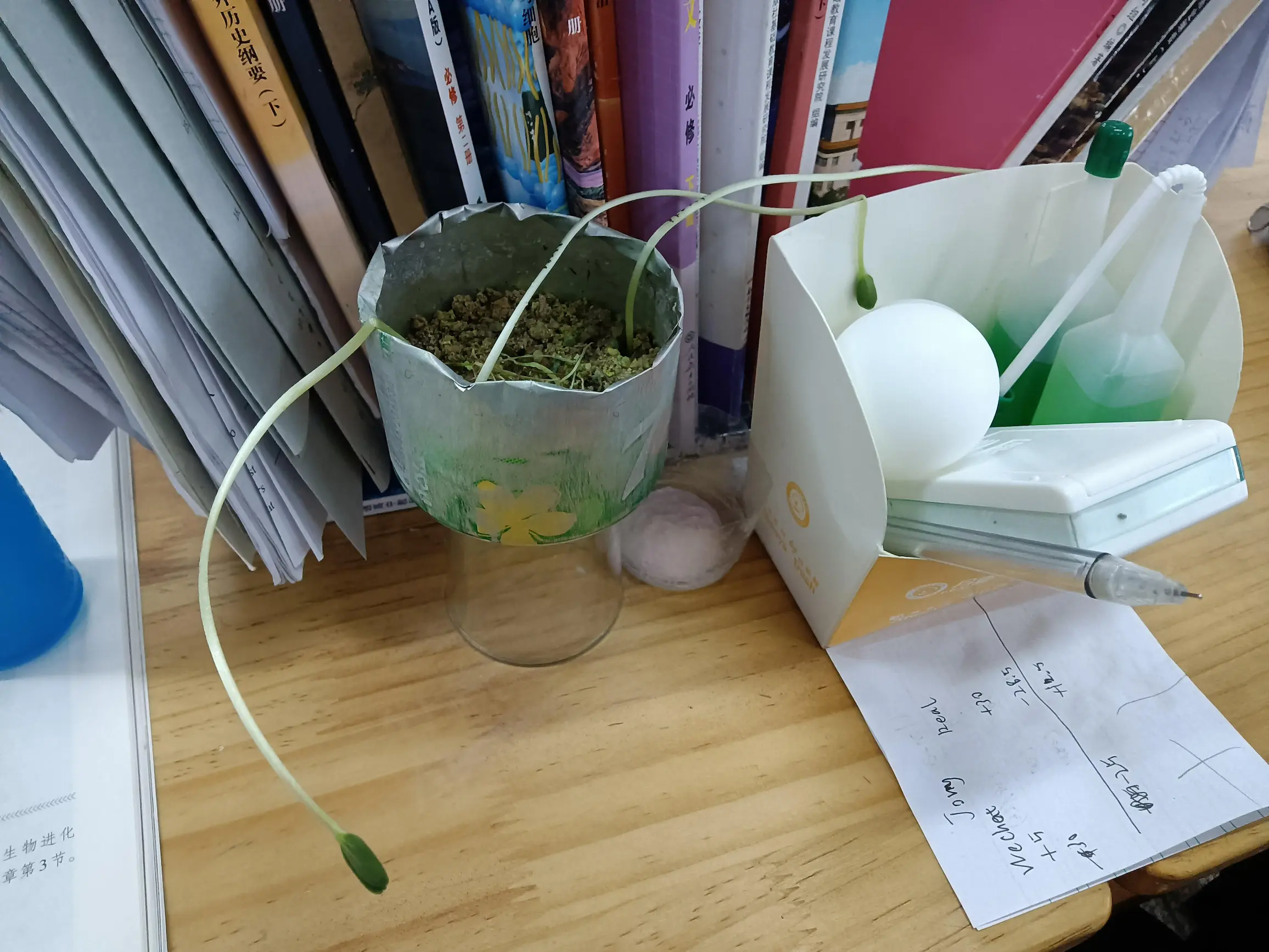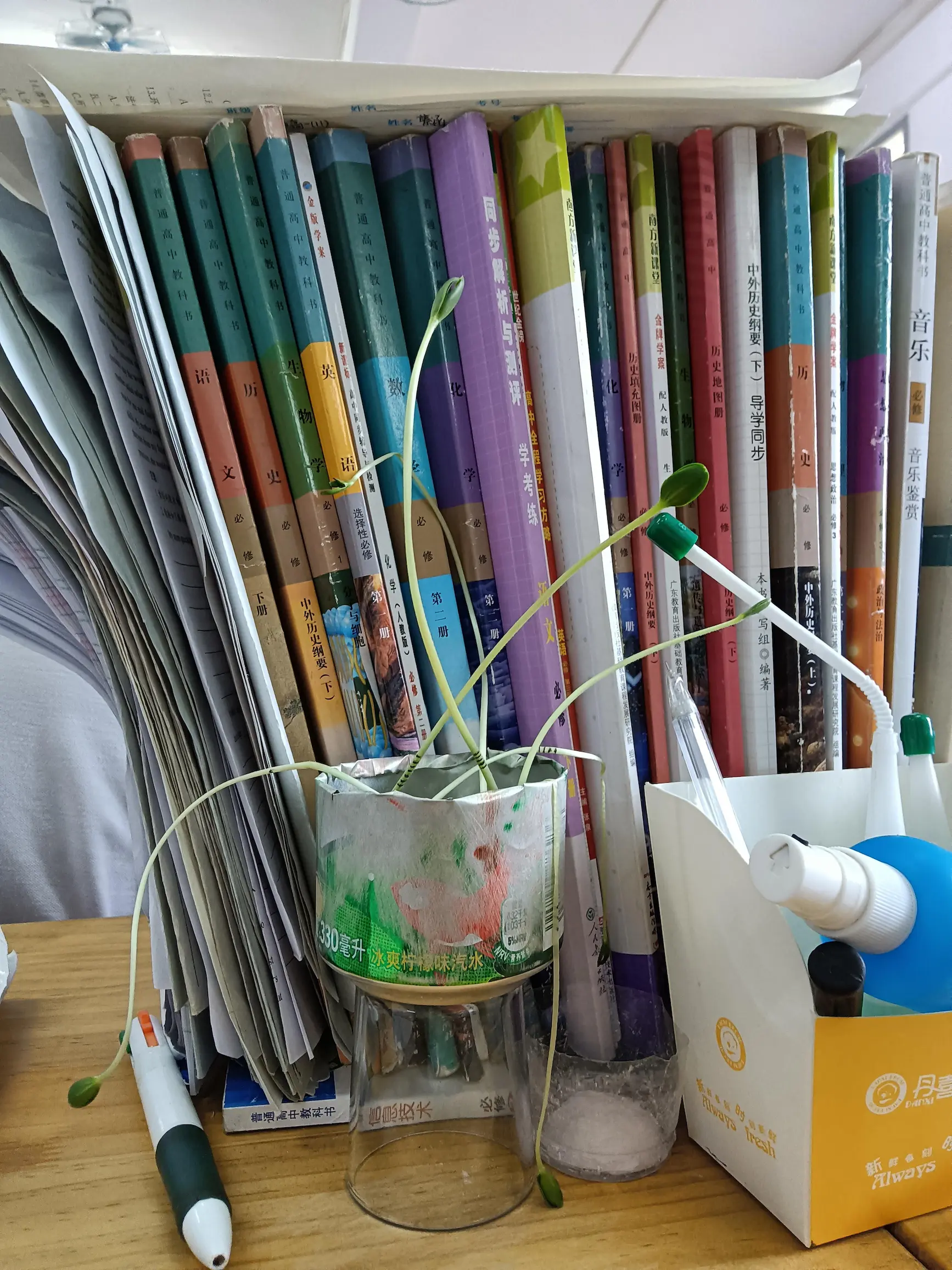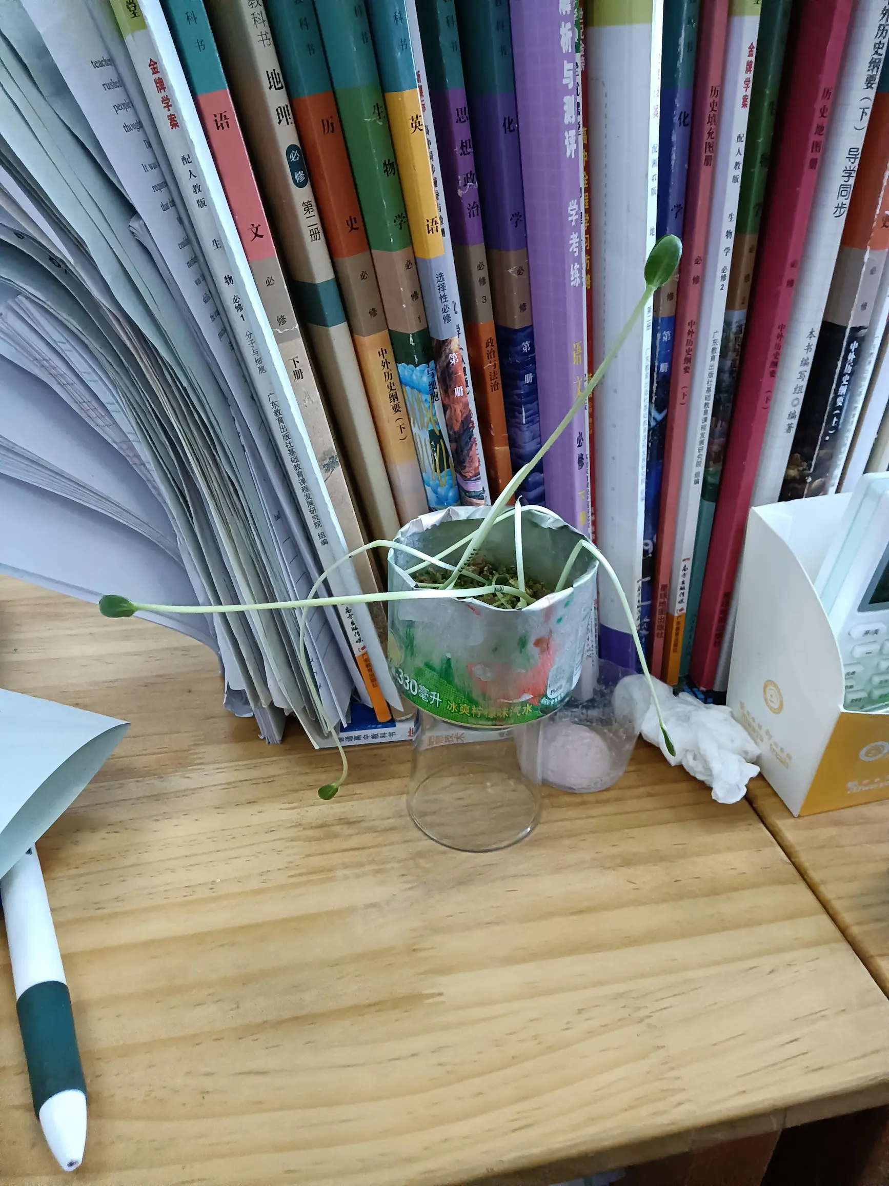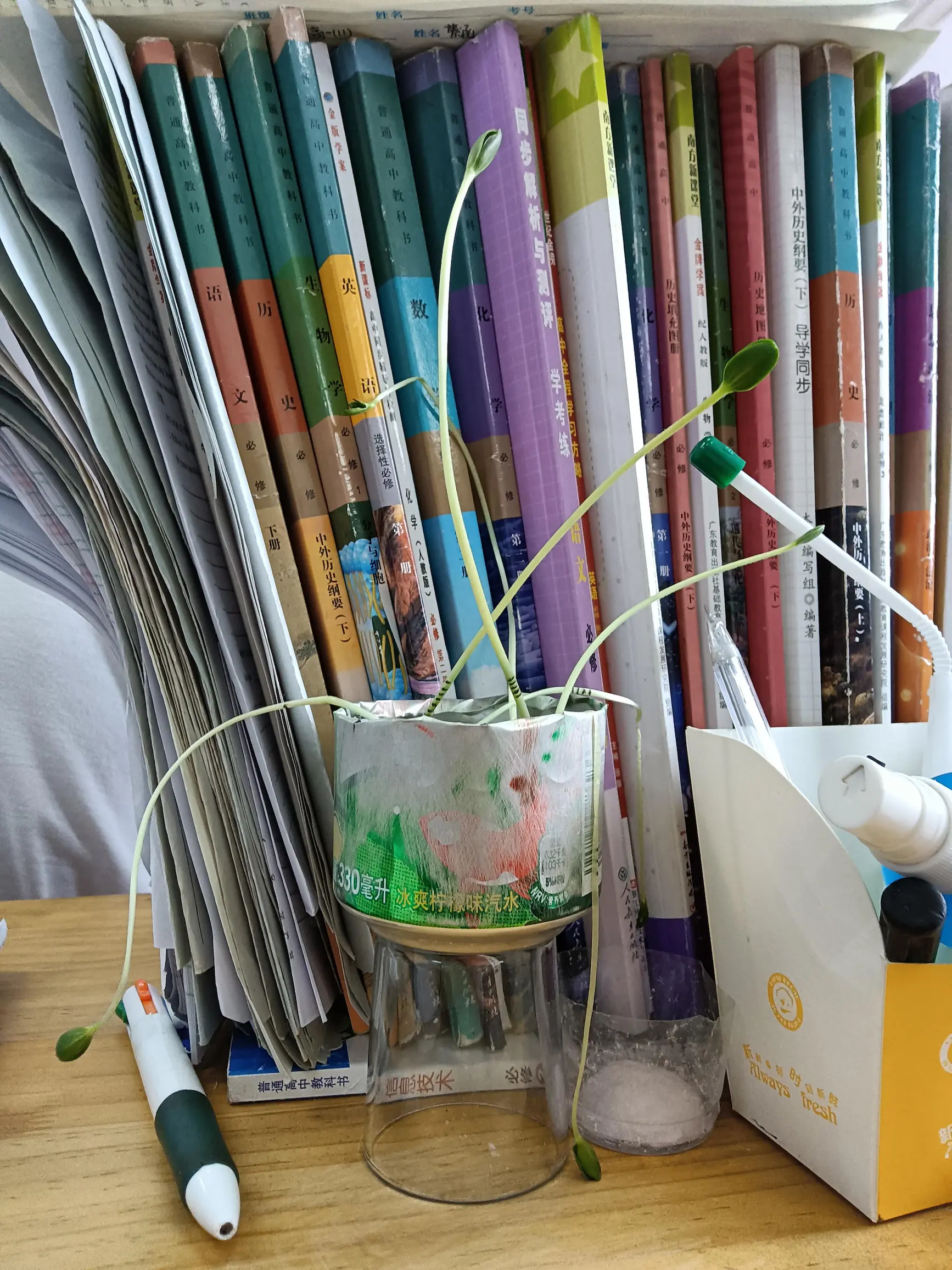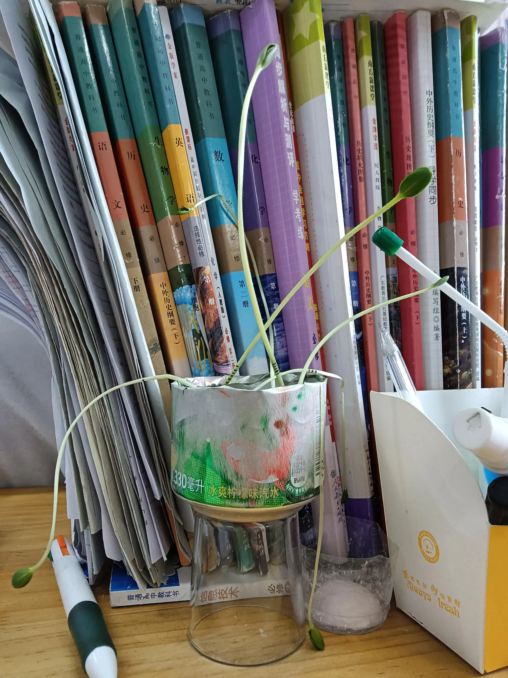 再过几天就要考试了,好多教室要作为考场,我所在的教室也是。于是我便将这棵黄豆搬到讲台上,靠在教室里原本那盆盆景上面。后来 Honzer 偶尔有来浇水,他还看见过有在那个考场的同学也有去浇水。