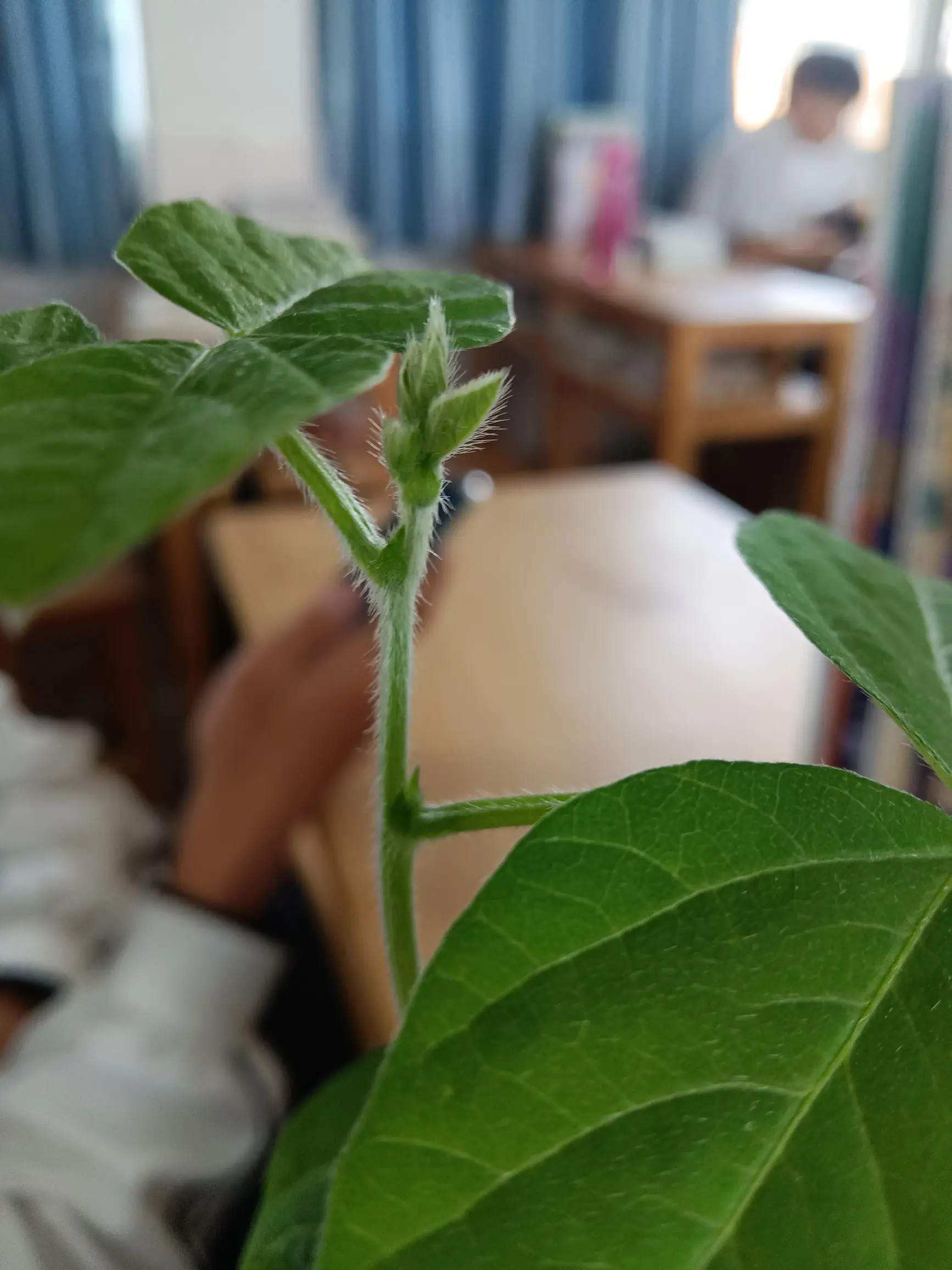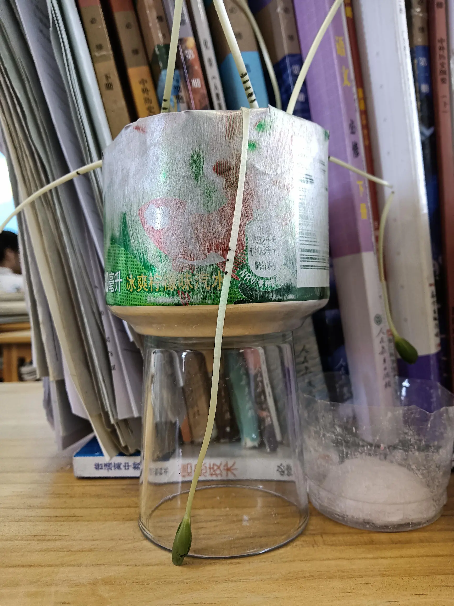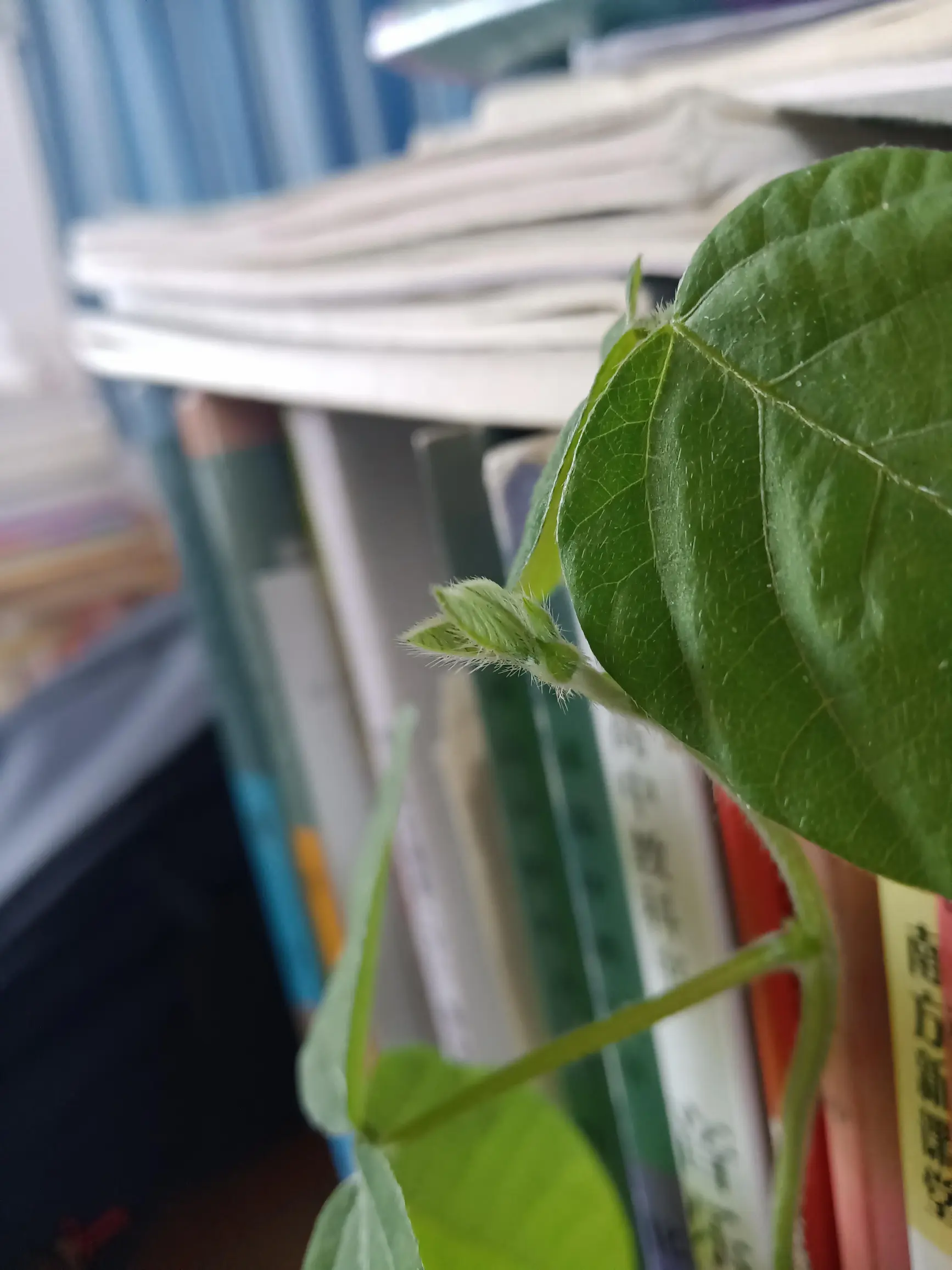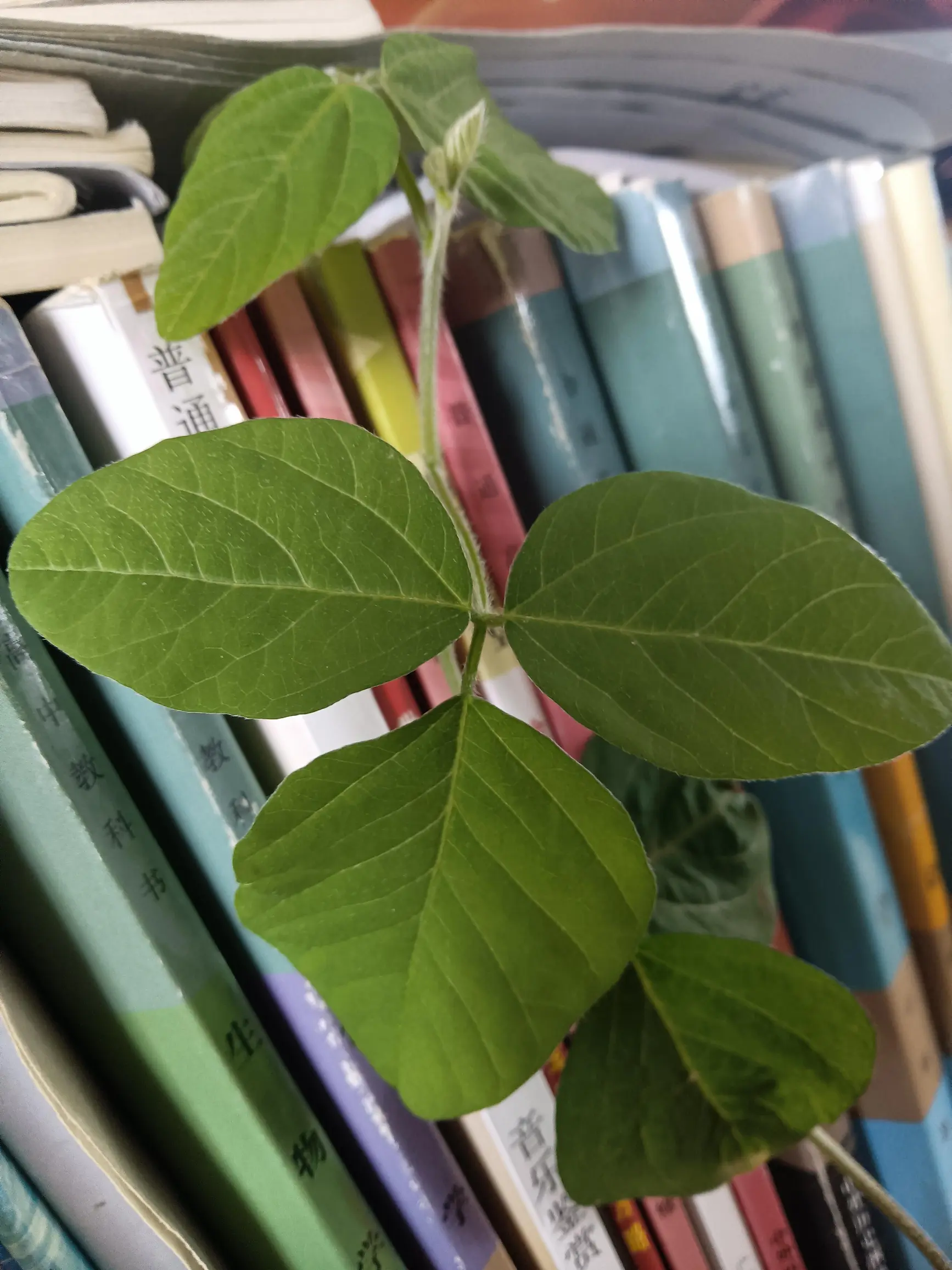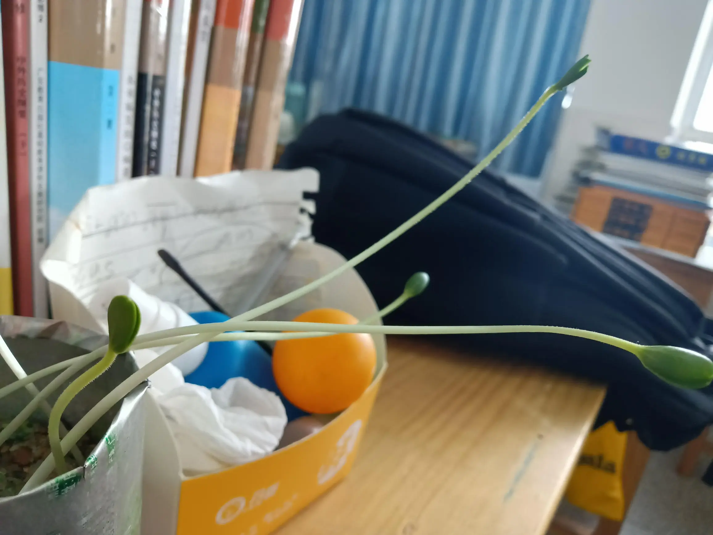 再过几天就要考试了,好多教室要作为考场,我所在的教室也是。于是我便将这棵黄豆搬到讲台上,靠在教室里原本那盆盆景上面。后来 Honzer 偶尔有来浇水,他还看见过有在那个考场的同学也有去浇水。