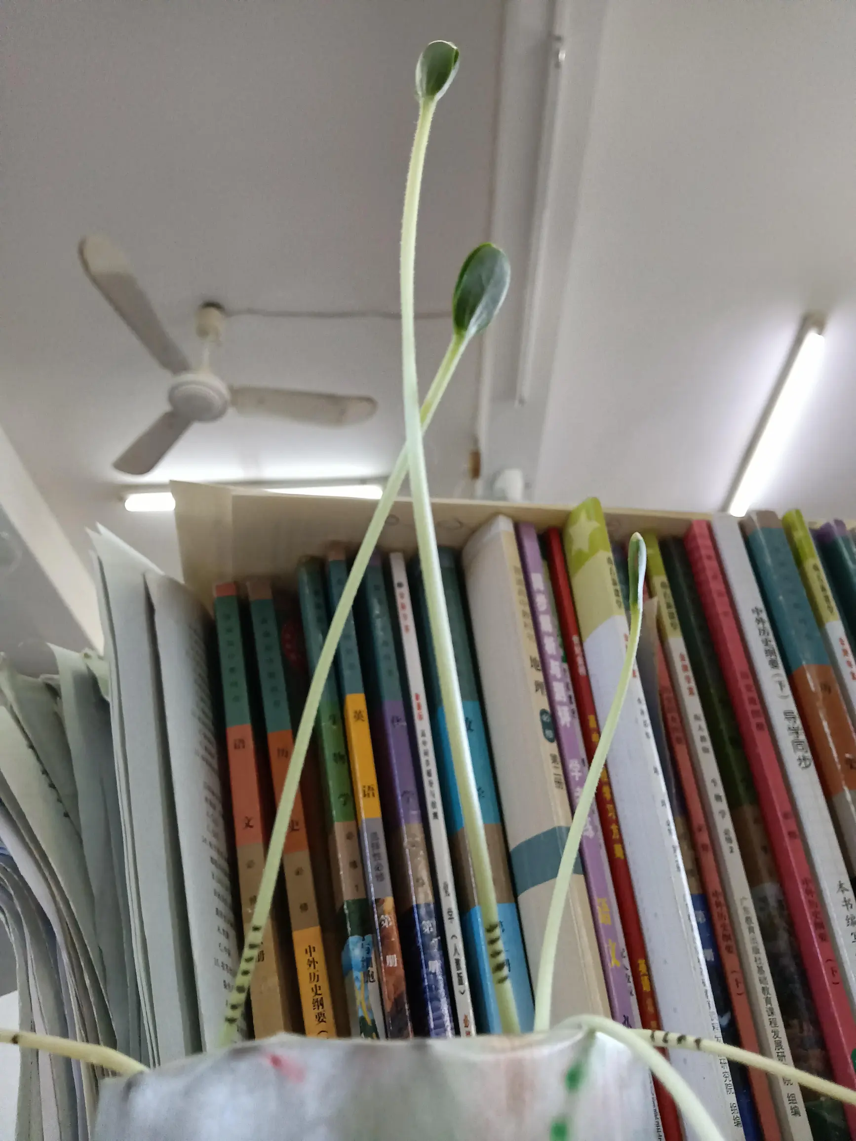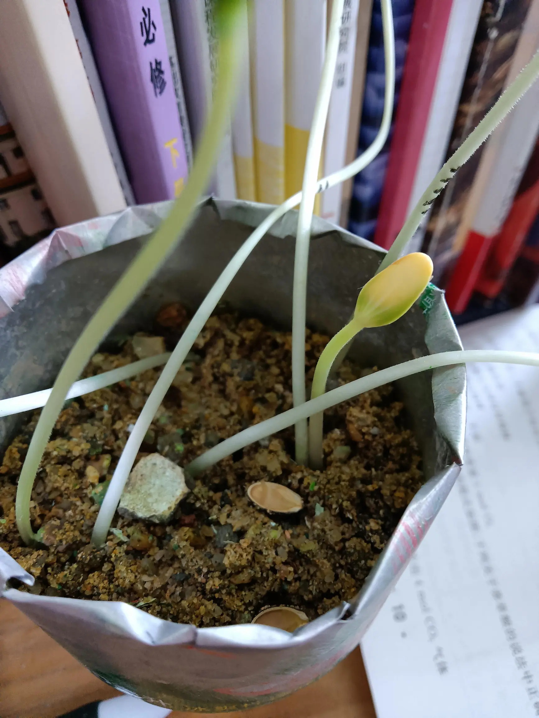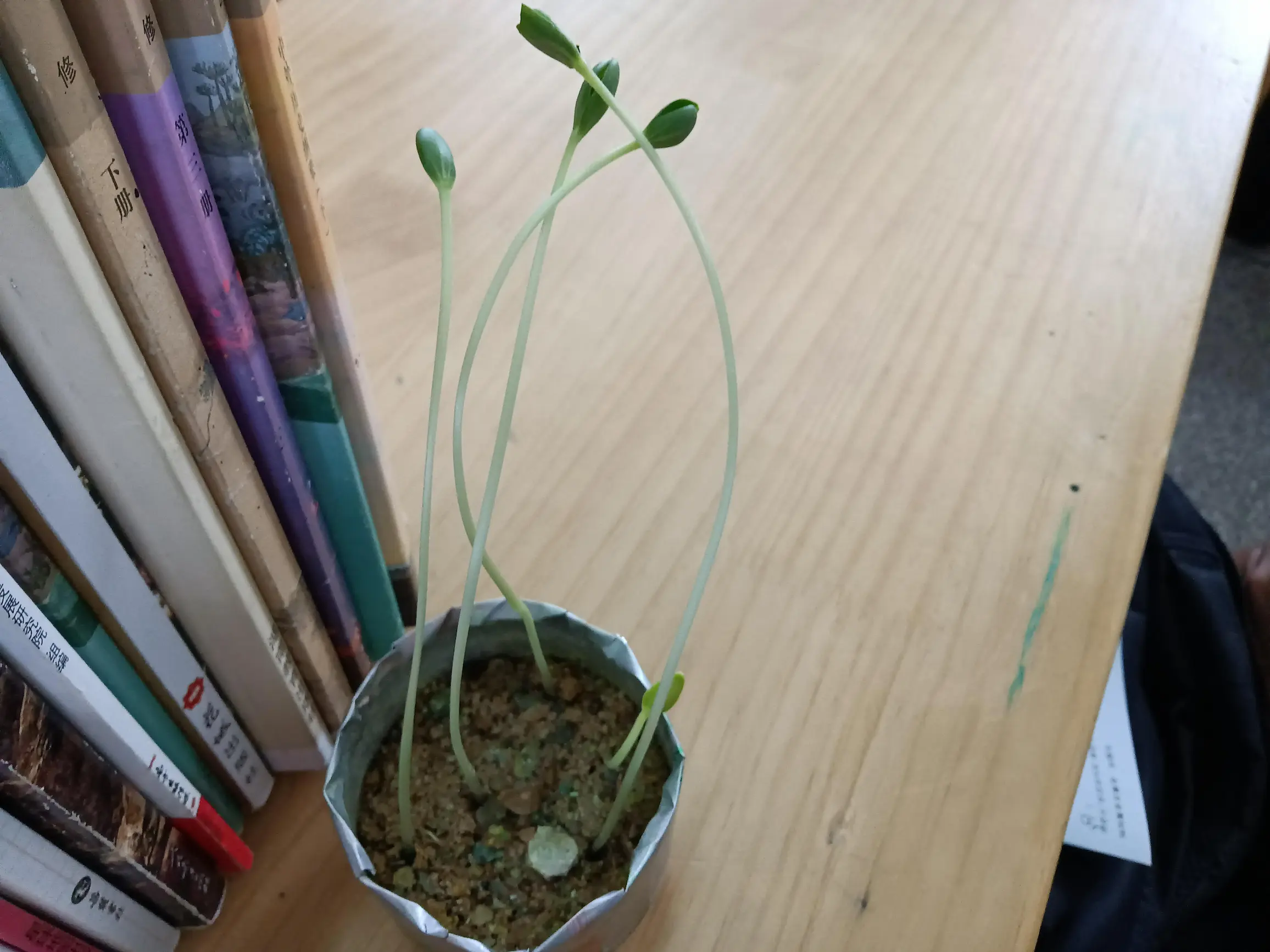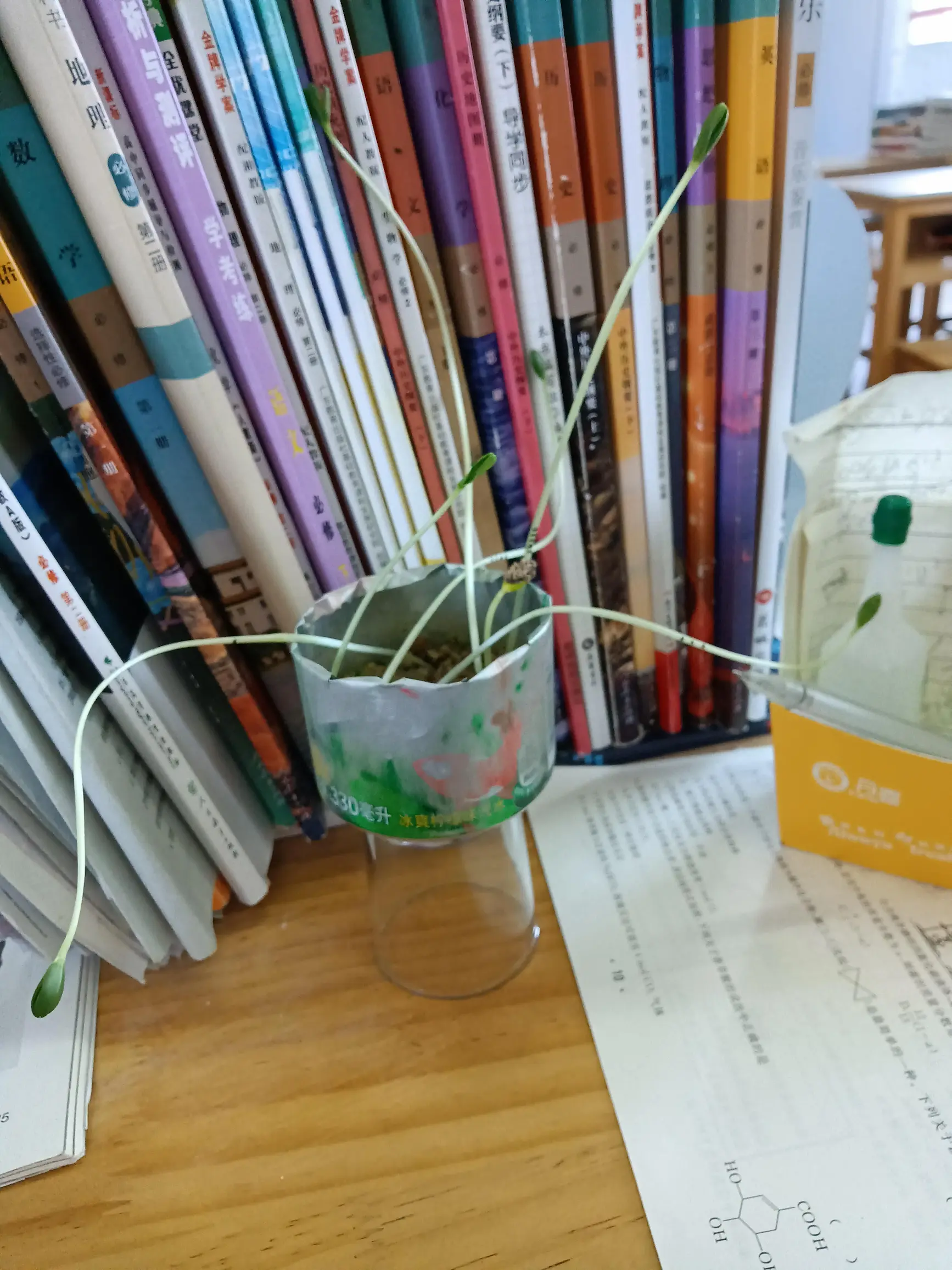 然而,今天下午,出了“大事故”。在放书的时候我实在是太不小心了,一下子压断了好几株,现在是剩下 2 株还健在,第 7 株发育良好,最让我期待的一株被我压死了。( ≧Д≦)